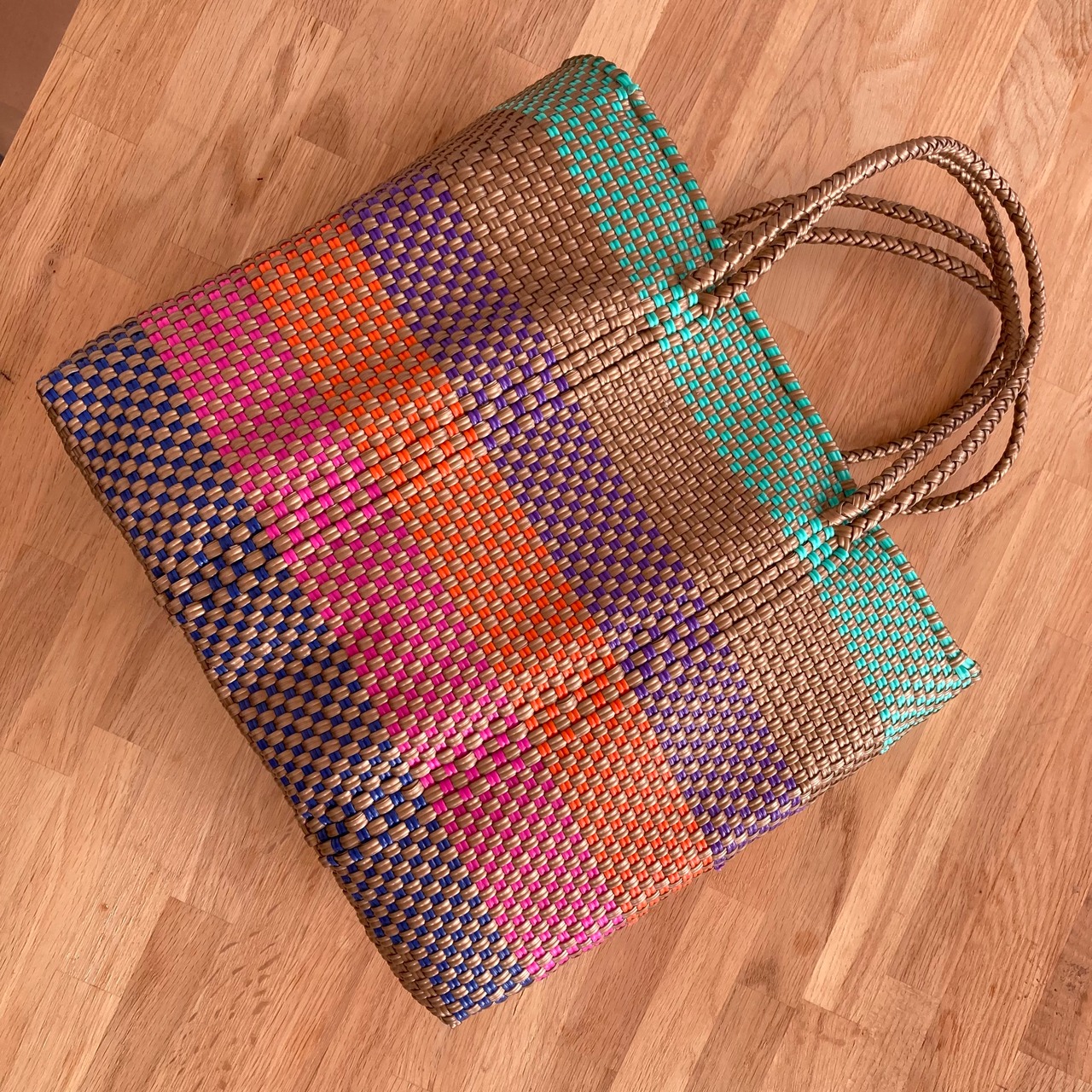 再生プラスティックを利用し、伝統的な技法で編まれた籠バックは、軽量で耐久性があることが特徴。汚れがついても、丸洗いができるので安心です。
